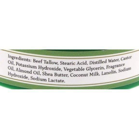Ingredients: Beef Tallow, Stearic Acid, Distilled Water, Castor Oil, Potassium Hydroxide, Vegetable Glycerin, Fragrance Oil, Almond Oil, Shea Butter, Coconut Milk, Lanolin, Sodium Hydroxide, Sodium Lactate